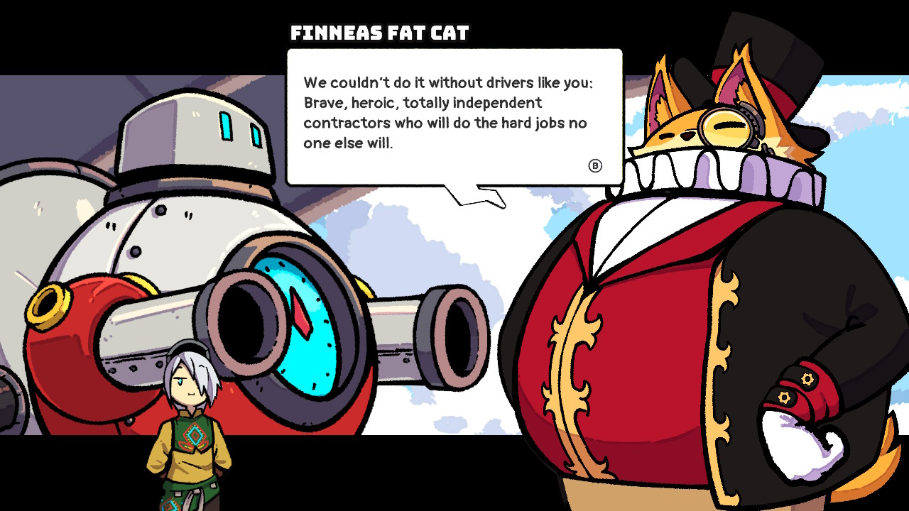The third screenshot is the opening of a mission, and Finneas Fat Cat (one of the “Barons” in the game) is displaying his “admiration” for you before sending you out to deliver building materials for his tank factory.