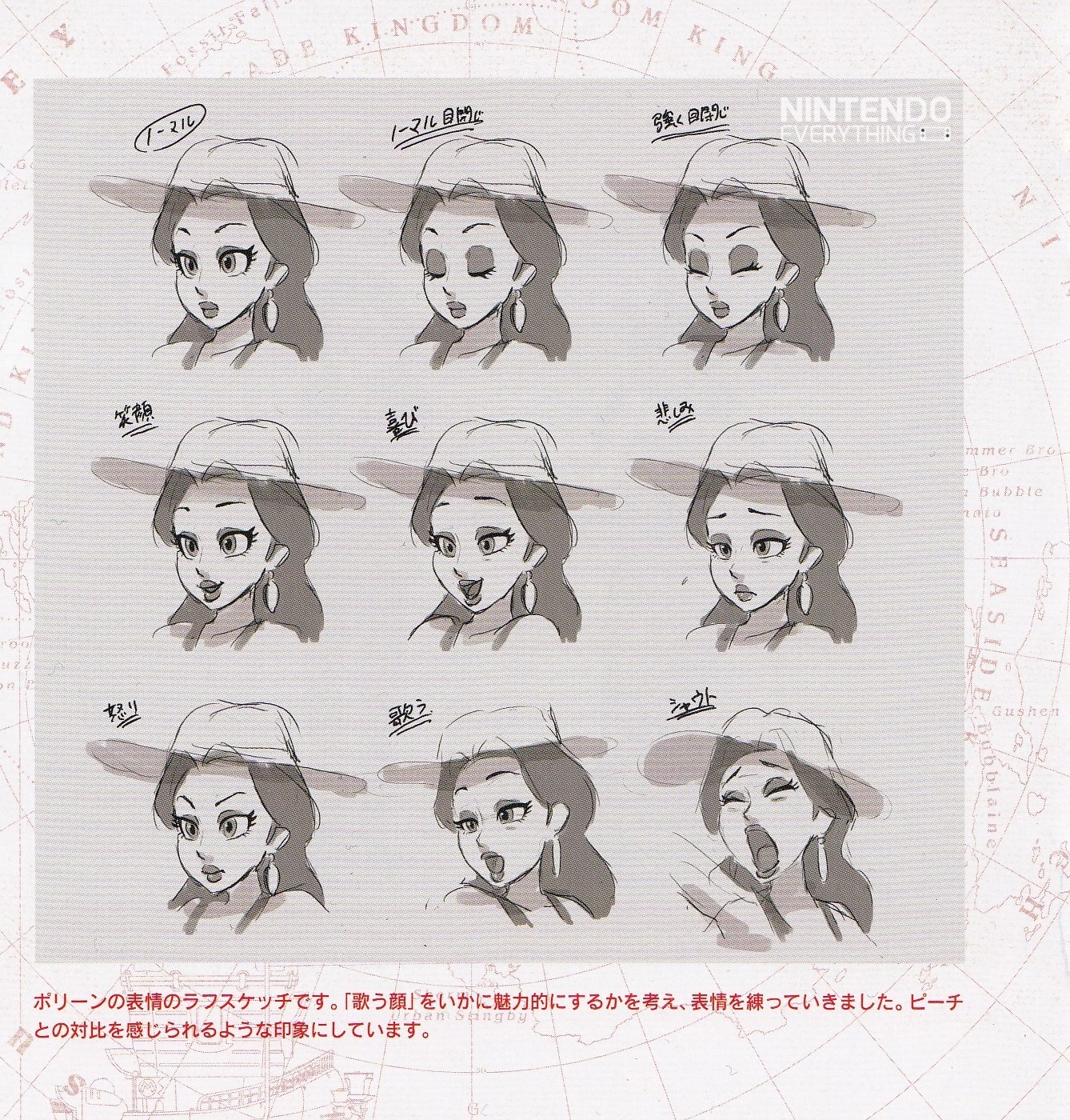 In the second gallery image, these are rough sketches for Pauline’s expressions. As Nintendo thought about how to make her singing face appealing, they polished her expressions. They leave an impression that feels like she can be compared contrarily to Peach.