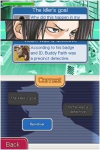 Rather than viewing locations from a first person perspective as in previous games, Edgeworth is given the freedom to wander around and check things in a third person view. It doesn’t change a whole lot but it makes the locations seem deeper than just a static background. As well as the new viewpoint, Investigations gives Edgeworth a few new tricks to use when examining crime scenes. Firstly there’s the Logic system, where Edgeworth stores various pieces of information in his head and can then link them together to reach logical conclusions. It’s neat, but there isn’t a whole lot to it. More interesting is the “Little Thief,” a gadget that Kay uses recreate crime scenes before the crime actually takes place. This adds another layer to the investigation, but unfortunately it’s only used about three times in the whole game. It’s also a shame that there are no sections that require you to use the DS’s touch screen like in the first Phoenix Wright game or Apollo Justice.