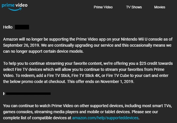 Another video service is biting the dust on Wii U. In an email sent to customers today, users are informed that support is ending on September 26. As a bit of compensation, Amazon is handing out $25 credit towards a Fire TV device.