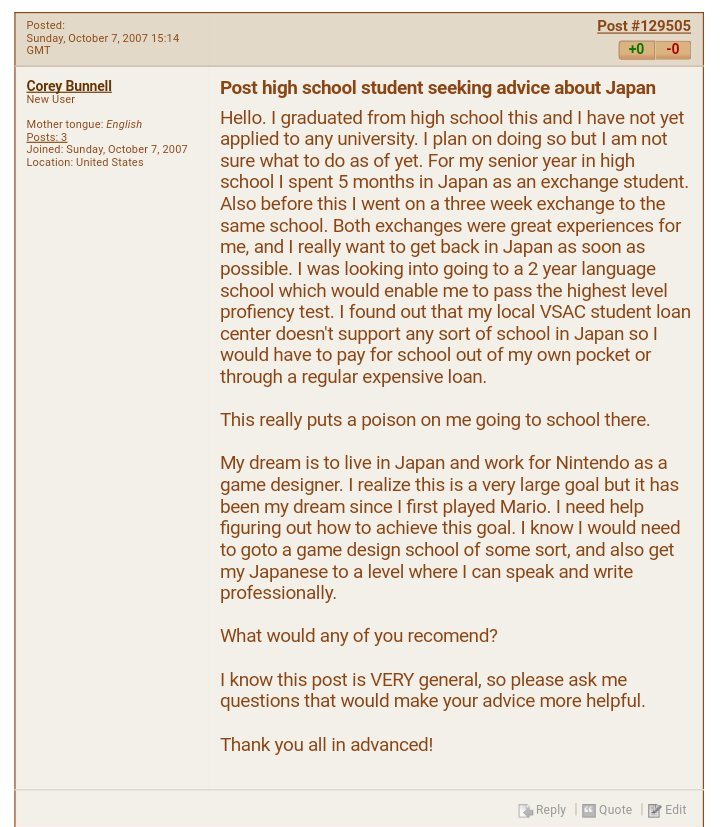 A decade ago, Corey Bunnell made a post on TranslatorsCafe about spending a good portion of his senior year in high school as an exchange student. He was able to live in Japan, and it sounds like it was a great experience. He later wrote about how his “dream is to live in Japan and work for Nintendo as a game designer.”