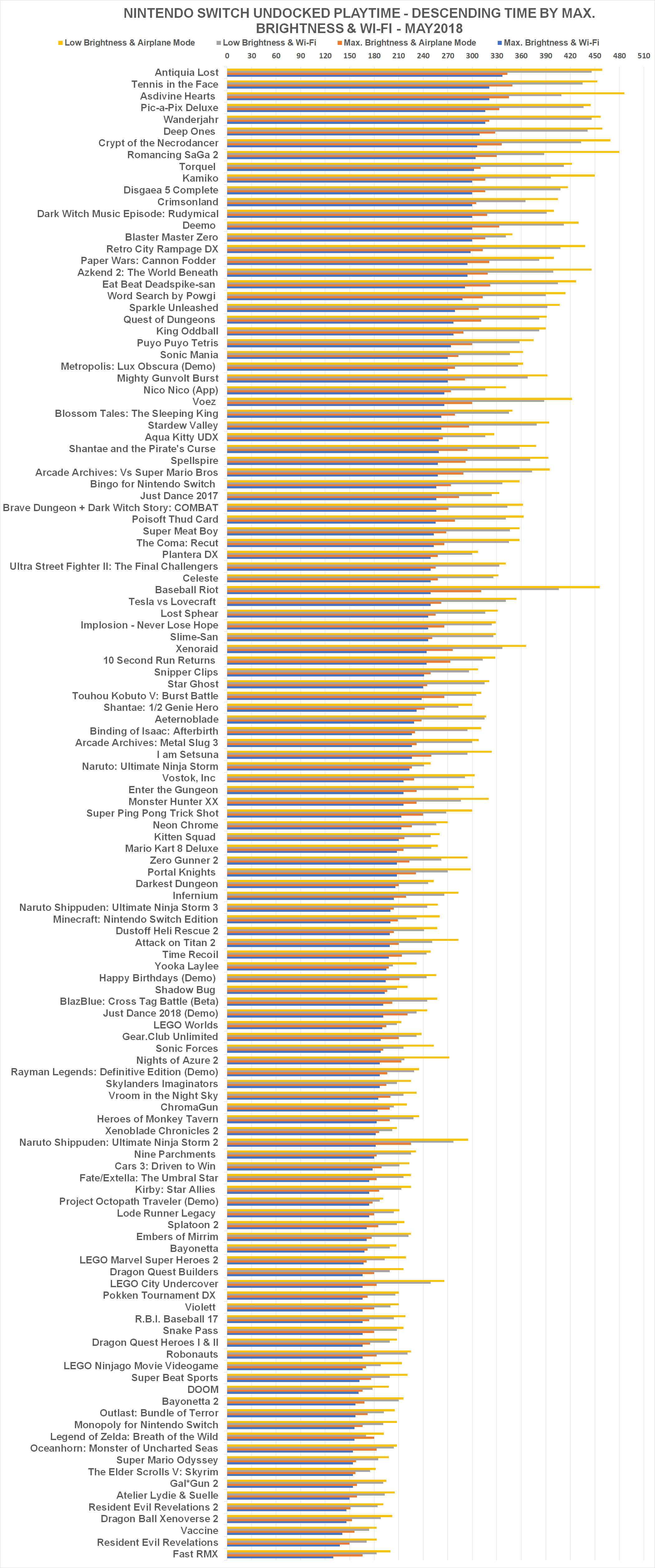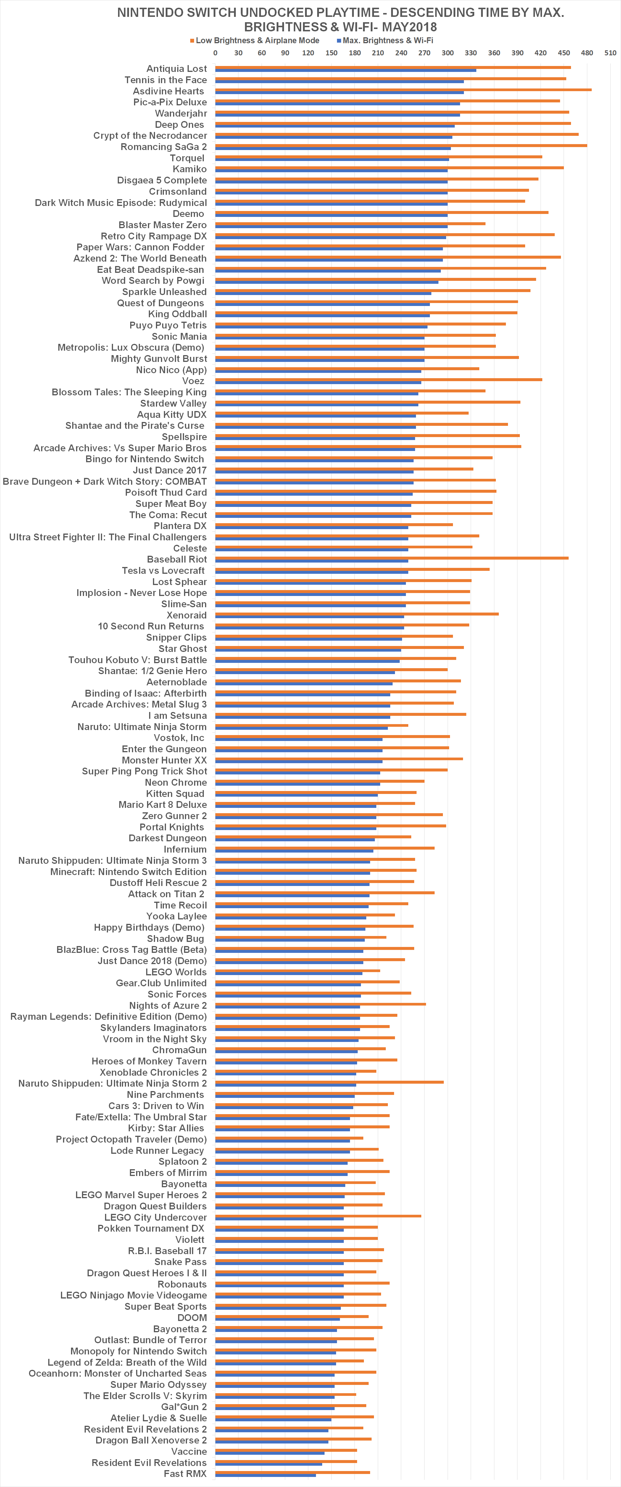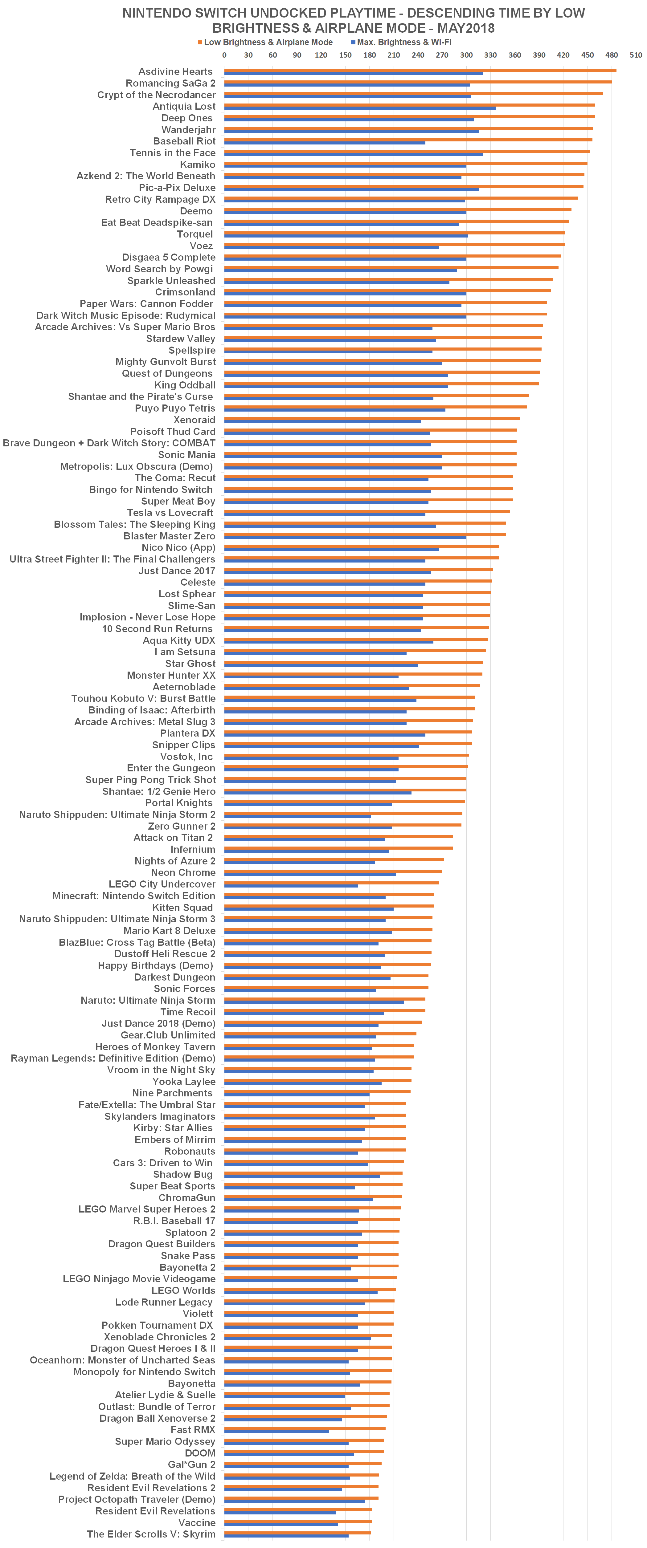 Some handy charts have been put together based on data collected by Reviews 2 Go. A whole bunch of different games have been ranked to show how long Switch’s battery lasts with each one. You can find the full set below.