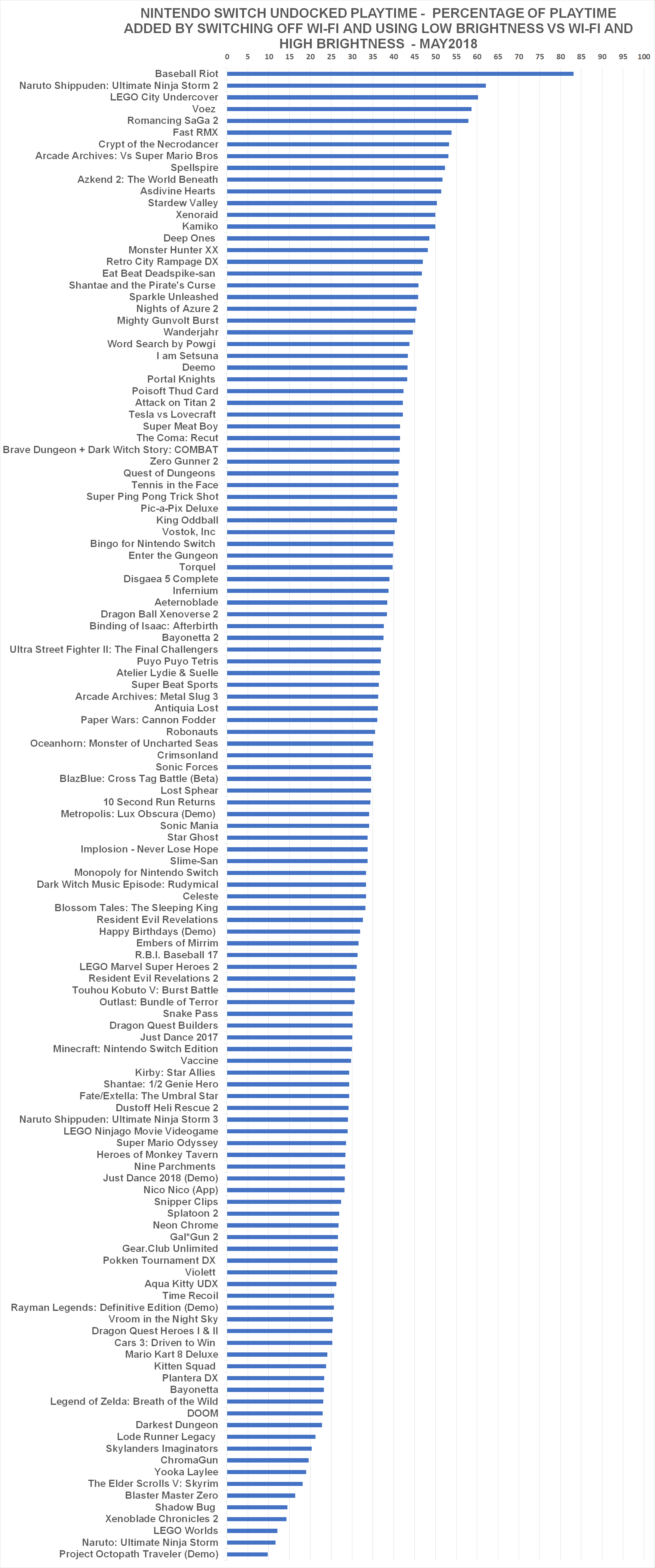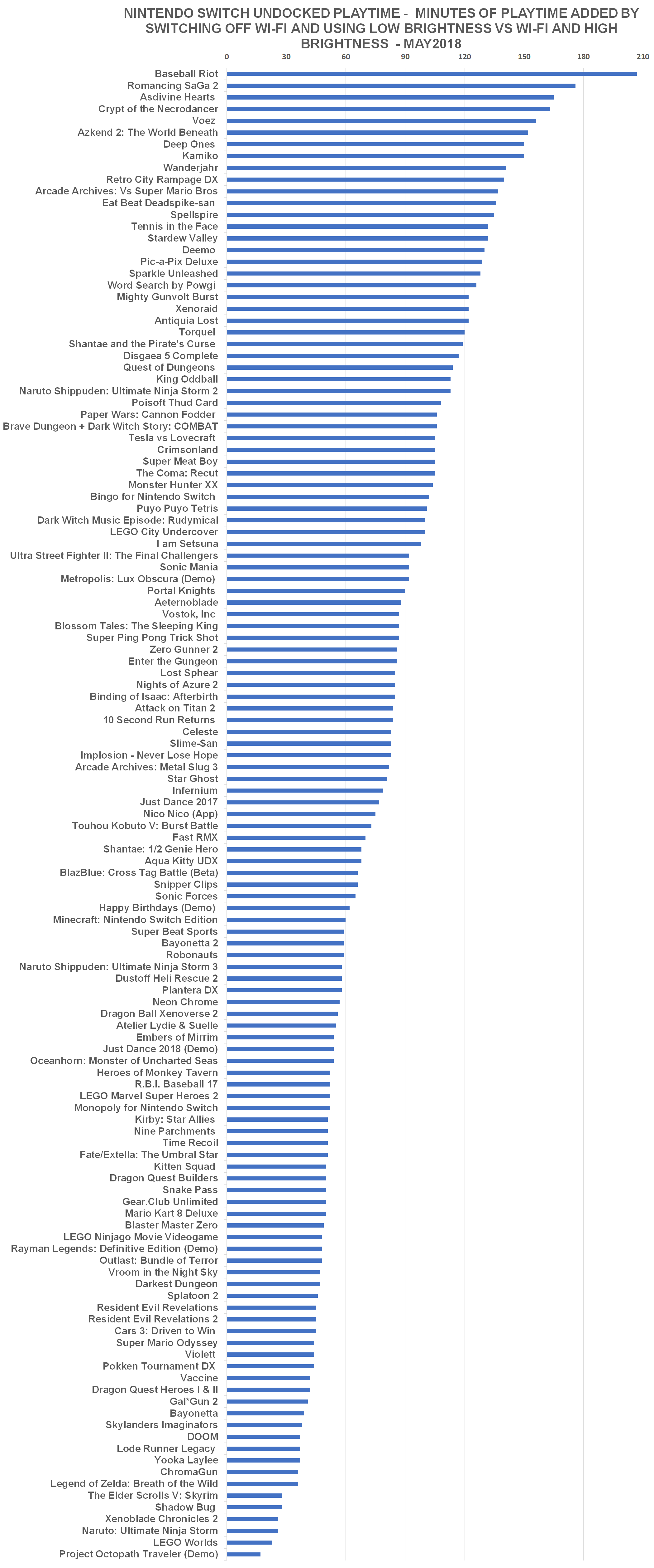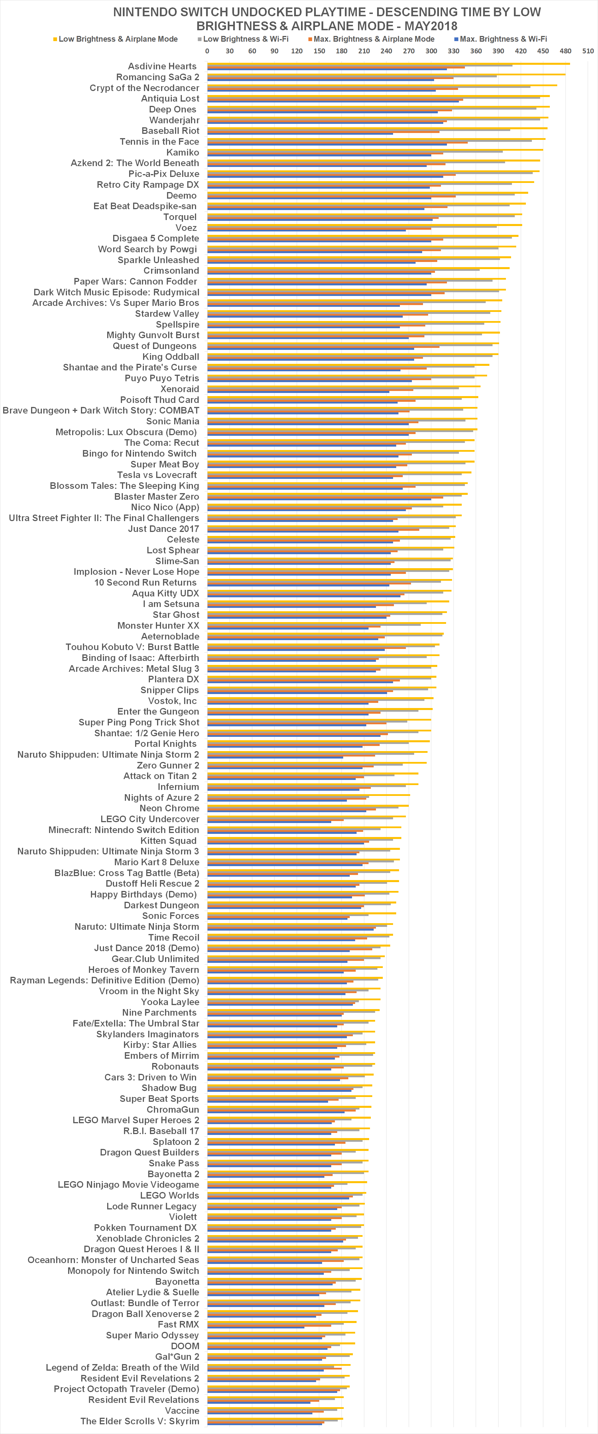 Some handy charts have been put together based on data collected by Reviews 2 Go. A whole bunch of different games have been ranked to show how long Switch’s battery lasts with each one. You can find the full set below.