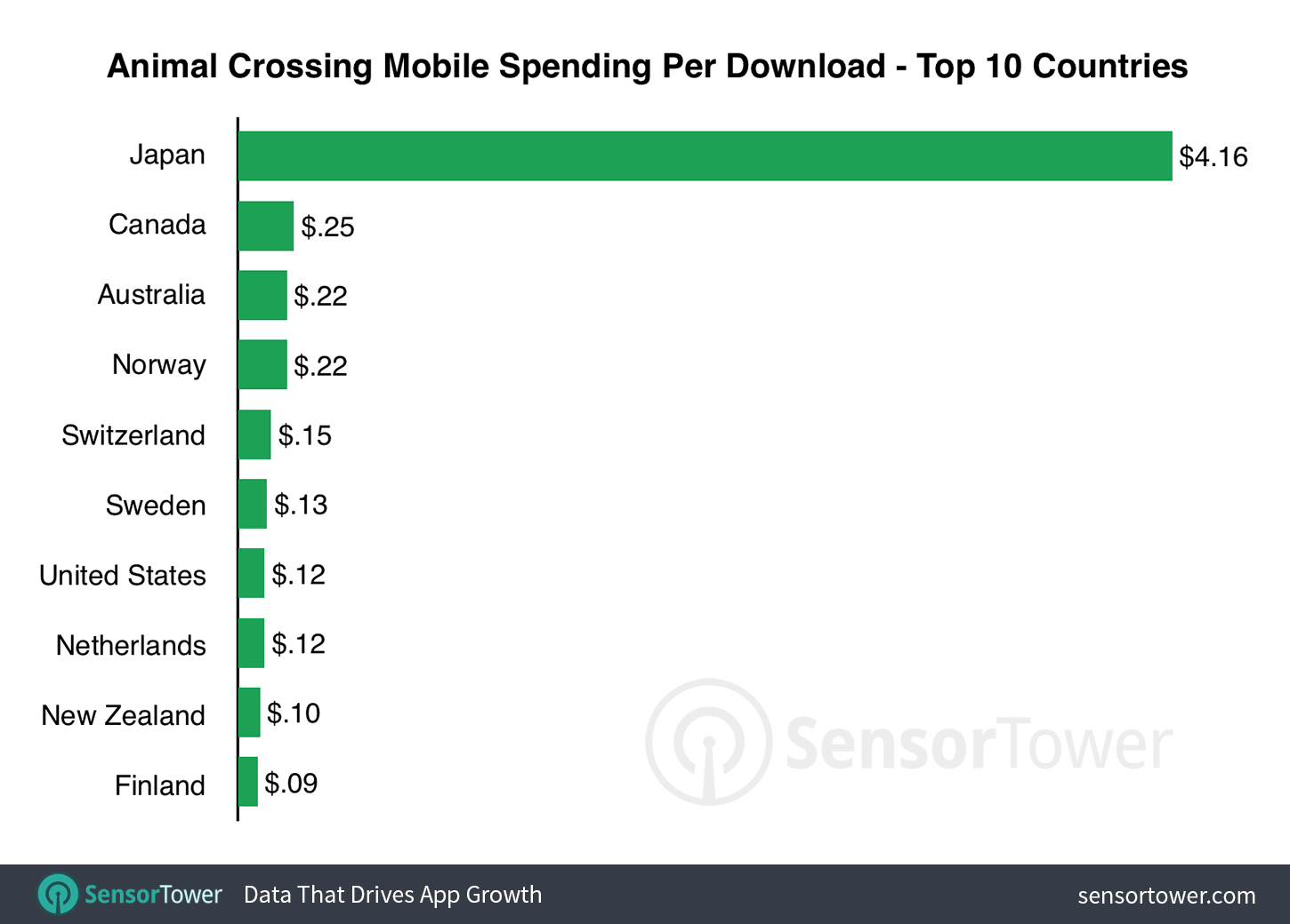 Japanese players are averaging $4.16 per download. Moreover, they have spent about 16 times as much on average per download than the second-highest-spending country, Canada, at 25 cents. Sensor Tower ranks the US seventh at an average of 12 cents per download.