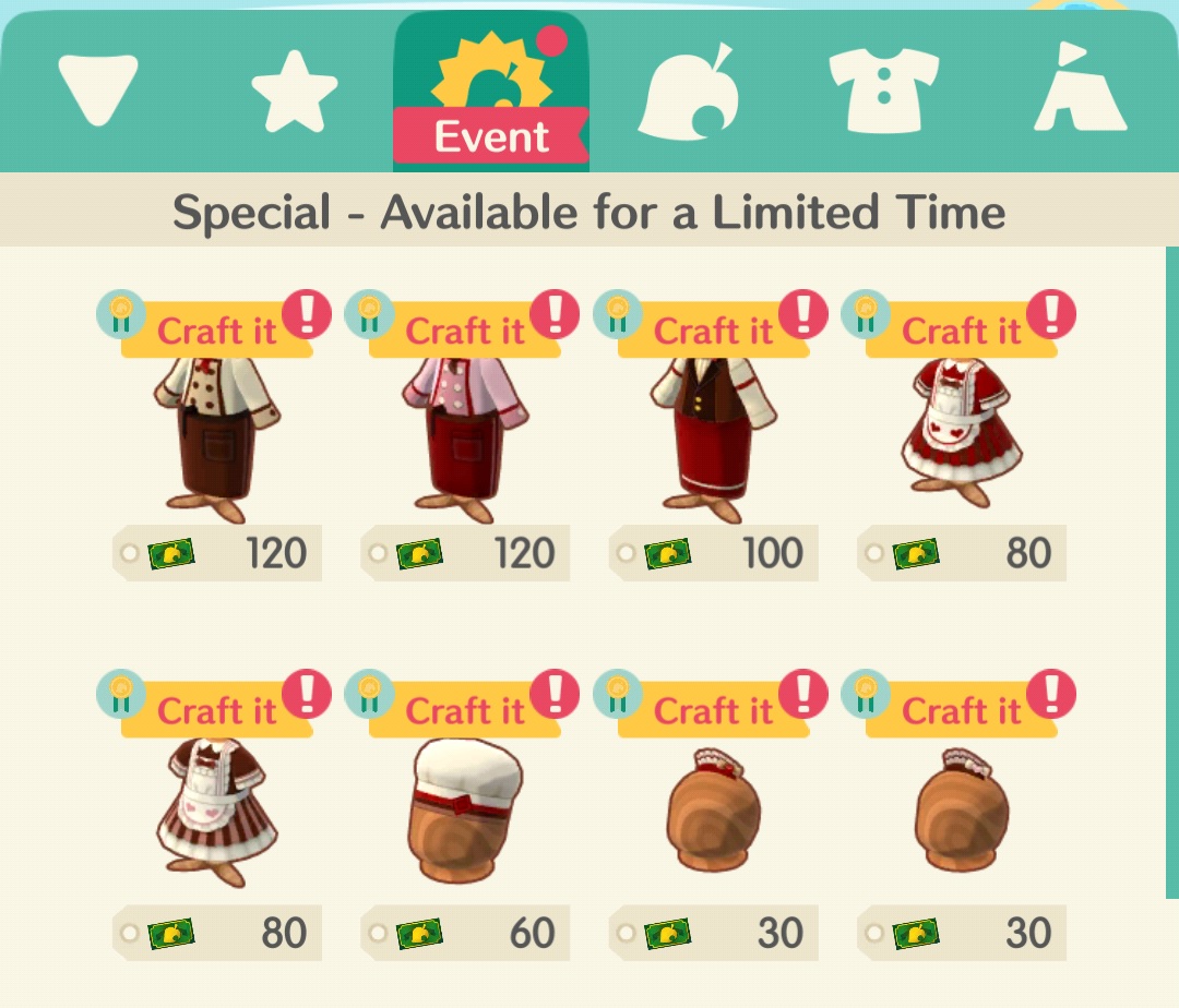 These outfits are available until March 15th. The following items are now available to craft in-game: chocolatier outfit, pink chocolatier outfit, sweet waiter outfit, sweet berry apron dress, cocoa apron dress, chocolatier hat, sweet berry lace hat, and the cocoa lace hat.
