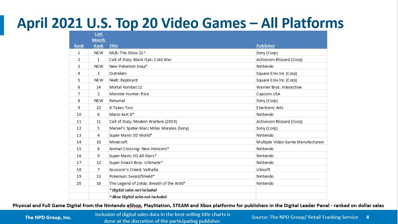 NPD Group has released a listing of the top twenty best-selling games in the U.S. for the month of April 2021. The results can be found below.
