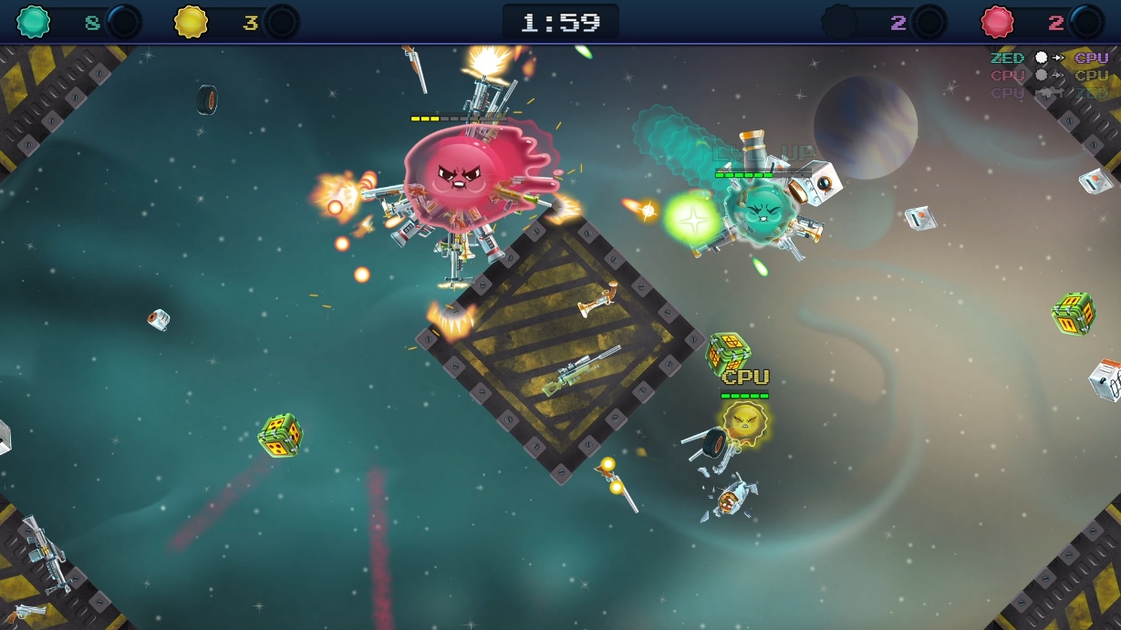 Keep in mind bigger does not always mean better! Smaller wobbly blob bodies move with unmatched agility and can launch supercharged dash attacks that deal a lethal blow to even the bulkiest of blobs. Amongst the carnage, look out for scrumptious space tacos to heal up and head back into battle. Size and wits matter in this fun-filled cosmic showdown of epic proportions.