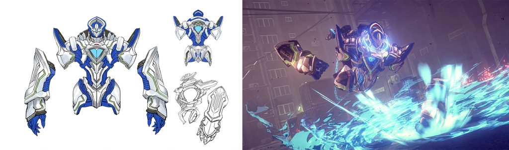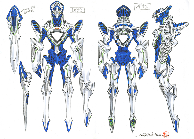 These early drawings are pretty rough, but as you can see, we started with a humanoid Legion. This would reinforce the idea that it was the main character’s partner, rather than just a tamed monster or weapon. We had long, hard talks over how far to take it. Should the Legion have eyes? Should you be able to actually talk with it? This was about when we started experimenting with tokusatsu aesthetics, like you might see in Japanese costumed hero TV shows like Ultraman or Kamen Rider.