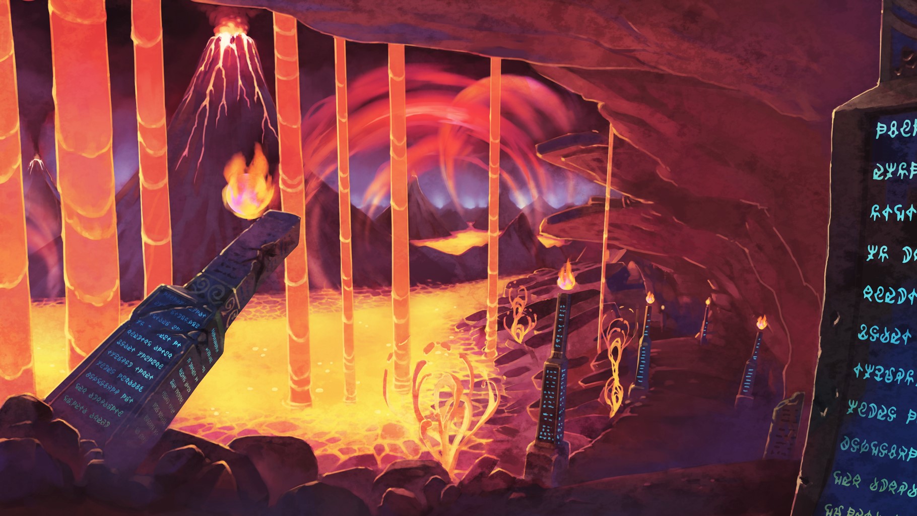 – A silhouette that appears to be some sort of stone monument can be seen within the flames