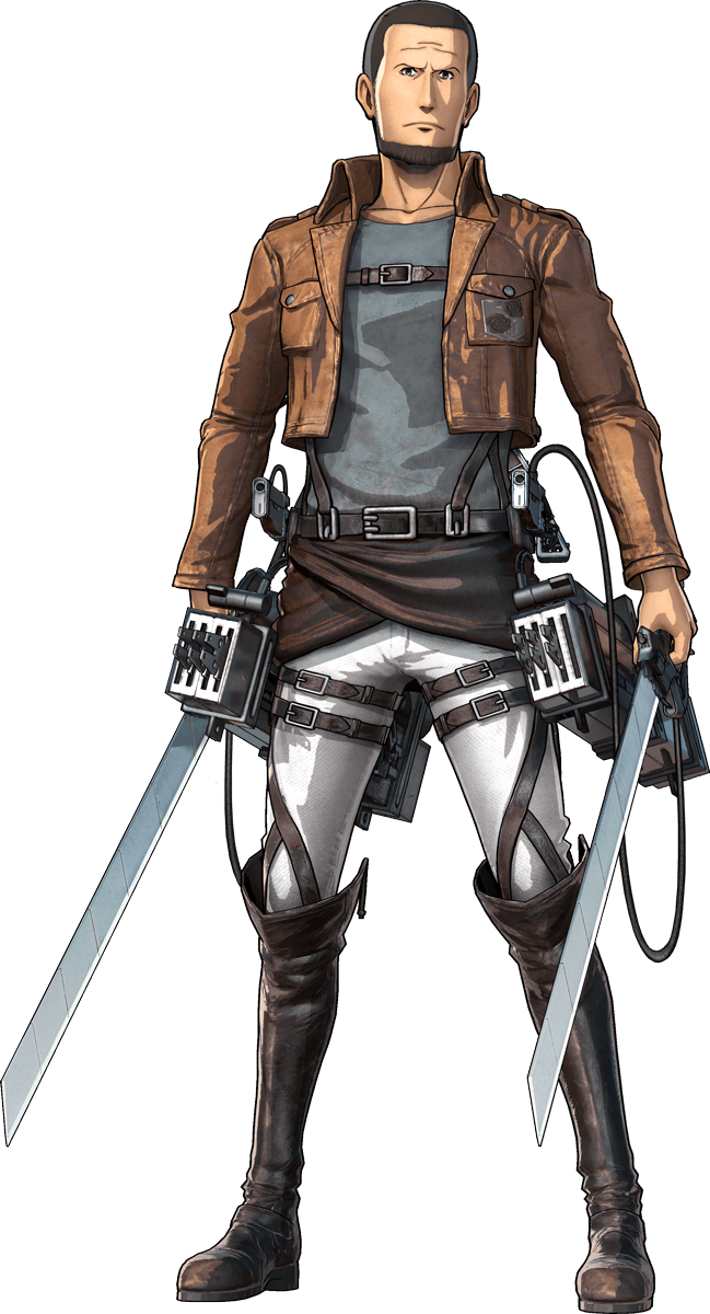 A soldier of the Garrison Regiment with a taste for alcohol. He once saved young Eren and Mikasa during the Colossal Titan’s attack on Shiganshina Distict but was overcame with fear of the Titans that he could not save Eren’s mother, Caria. Following the attack, he eventually became a captain of the Engineering Corps in the Trost District.
