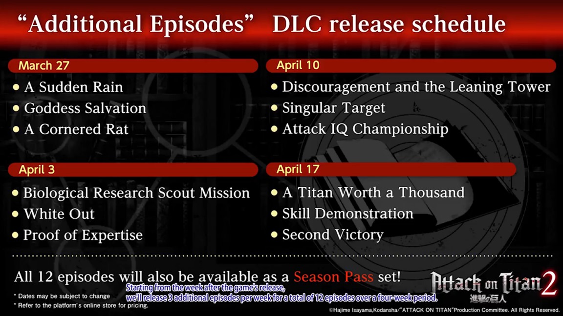 Towards the end of the broadcast, the schedule for additional DLC episodes was posted. A total of twelve episodes will be released between March 27 and April 17.