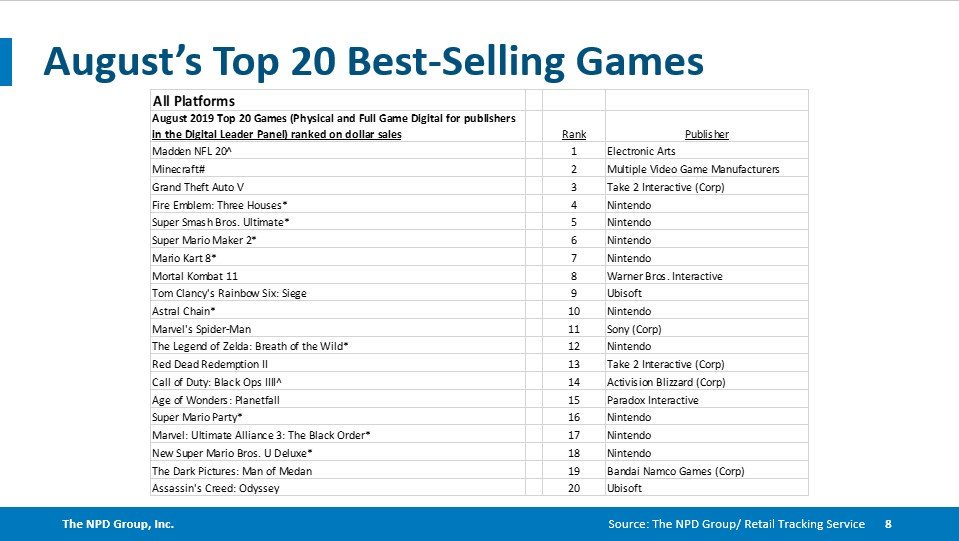 NPD Group has released a listing of the top twenty best-selling games in the U.S. for the month of August 2019. The results can be found below, which includes Astral Chain in the top ten despite launching at the end of the month.