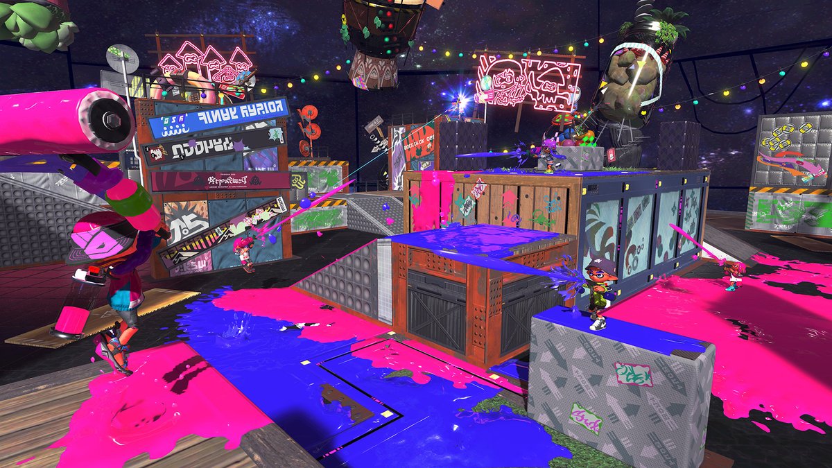 Nintendo’s twitter has just shown off a few images of the upcoming Splatfest in Splatoon 2. The maps are Manta Maria and Shifty Station, check them out below.