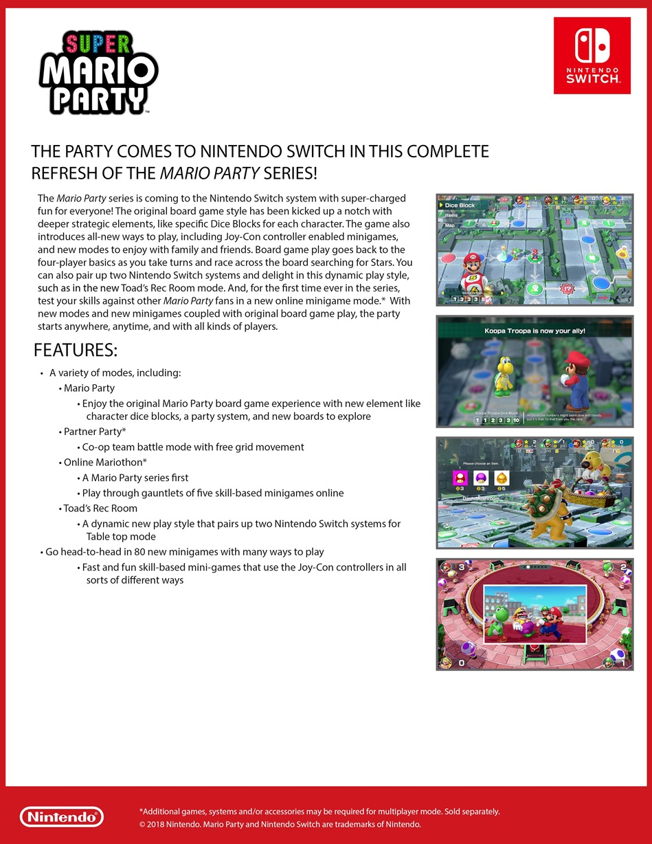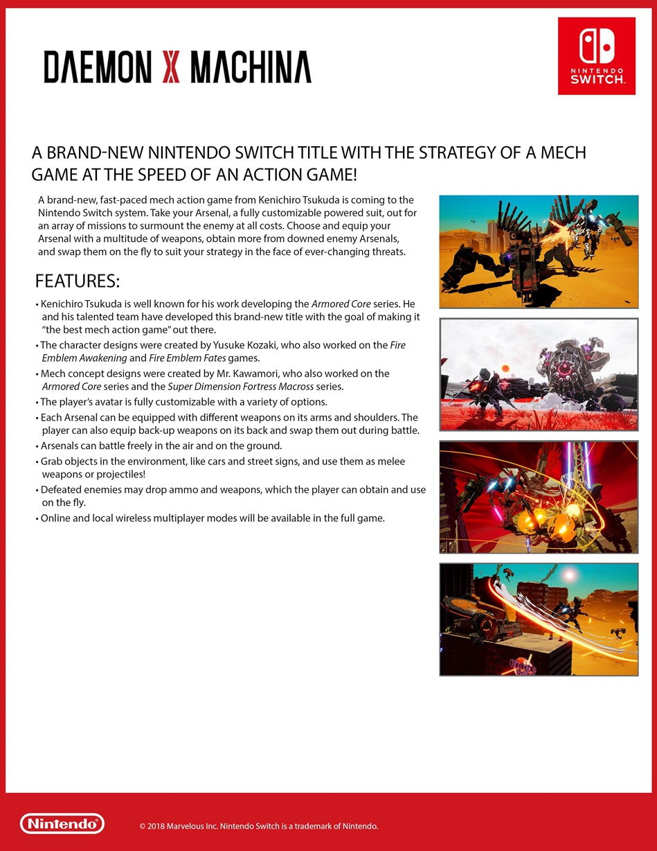 Nintendo has passed along updated fact sheets for a trio of games featured at E3 this week: Daemon X Machina, Xenoblade 2: The Golden Country, and Super Mario Party. All three received updated information following the Nintendo Direct that took place a few days ago. For the latest details, check out the fact sheets below.