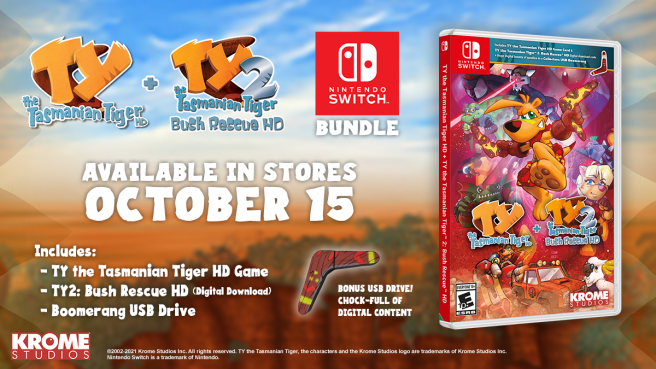 Additionally, the Switch is getting an exclusive bundle that will include: the physical version of TY the Tasmanian Tiger HD, a digital download for TY the Tasmanian Tiger 2: Bush Rescue HD, and a collectible boomerang-shaped USB with bonus digital content.