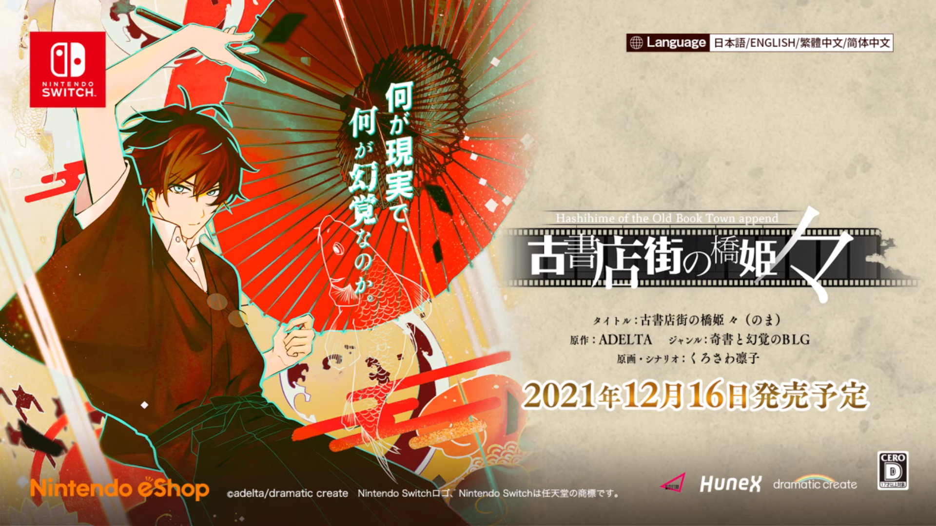 Another visual novel is coming to the Switch on December 16, 2021 called Hashihime of the Old Book Town Append. It is developed by Adelta and published by Dramatic Create, and it’s described as “mysterious and psychedelic boys love.”