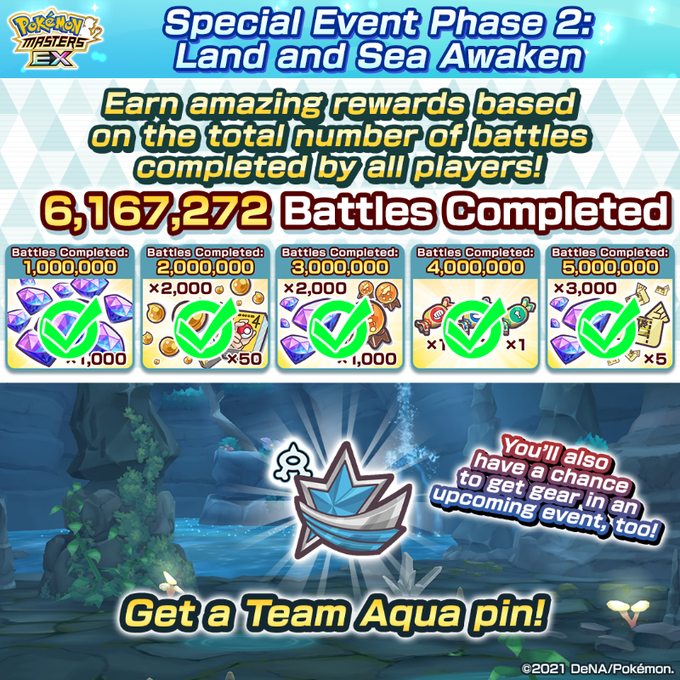 The Land and Sea Awaken event has had enough player participation to encompass over 5 million battles. As a result, the Pokemon Masters Team will give out the following rewards to all players: