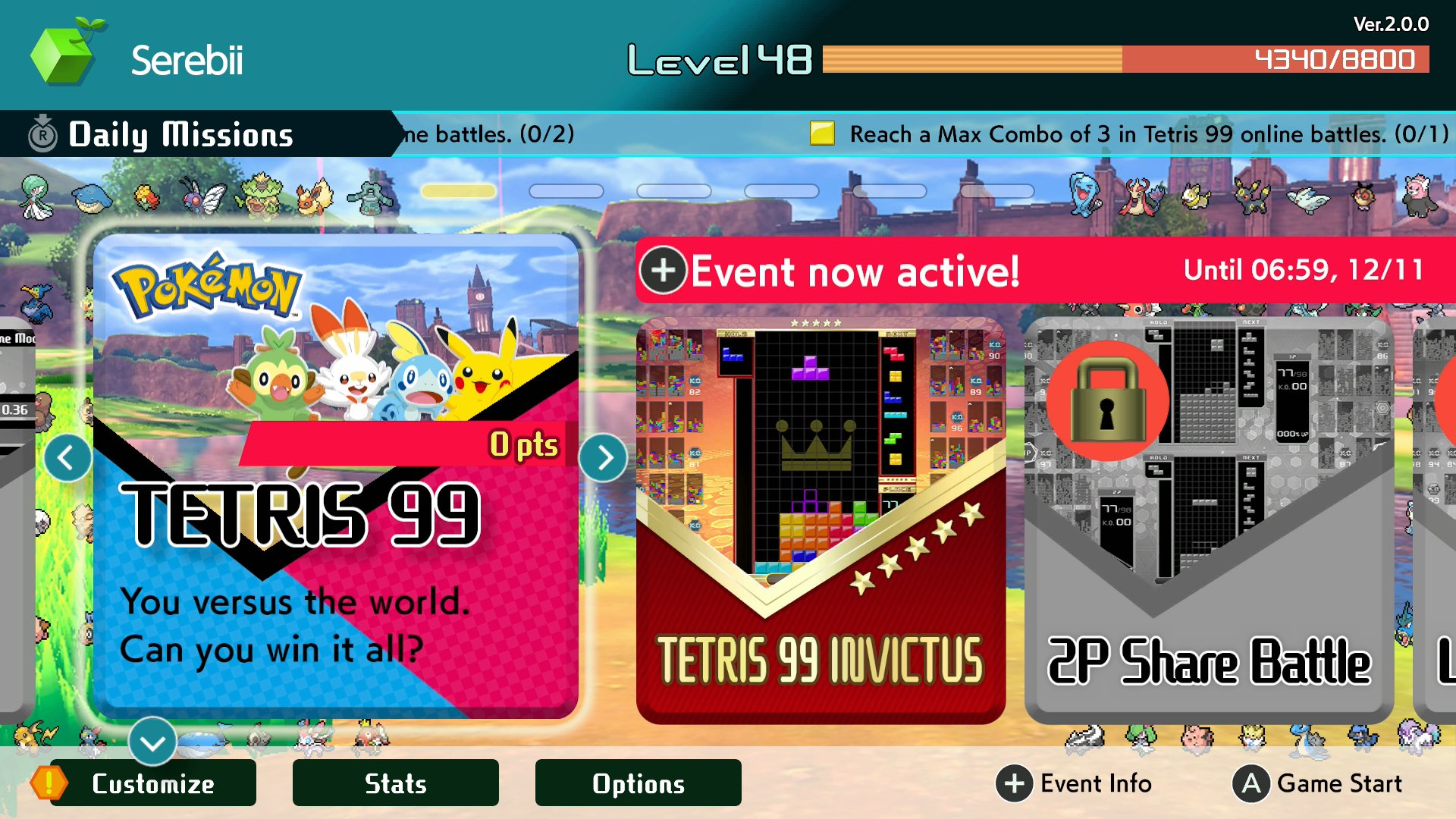 The Tetris 99 Pokémon Sword & Shield promotional event is now live until 06:59 UTC on November 11th. A special Tetris 99 Maximus Cup based on Pokémon Sword & Shield is now playable. Players can earn the theme based on the Wild Area with Pokémon music if they achieve 100 Points during the special event by ranking in various matches. Once obtained, players will be able to use it forever.