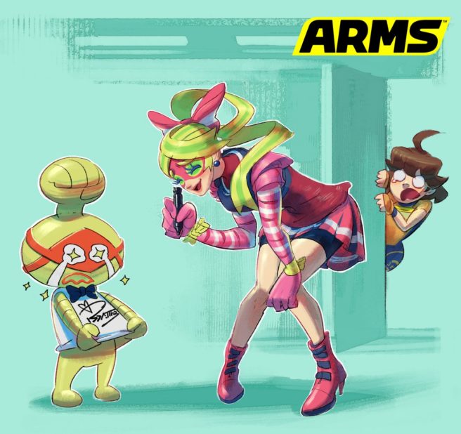 After having a look at new characters Twintelle and Byte & Barq, today Nintendo has put out another piece of ARMS art. This one shows Ribbon Girl signing Biff’s shirt, while Mechanica admires her from the distance. Take a look at the image above.