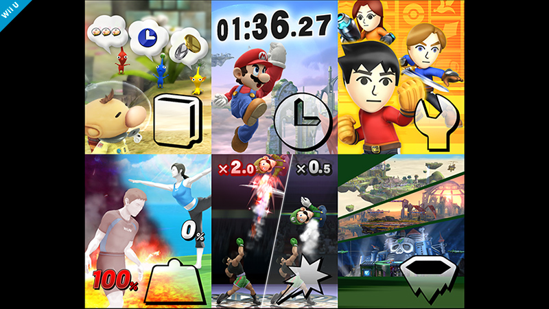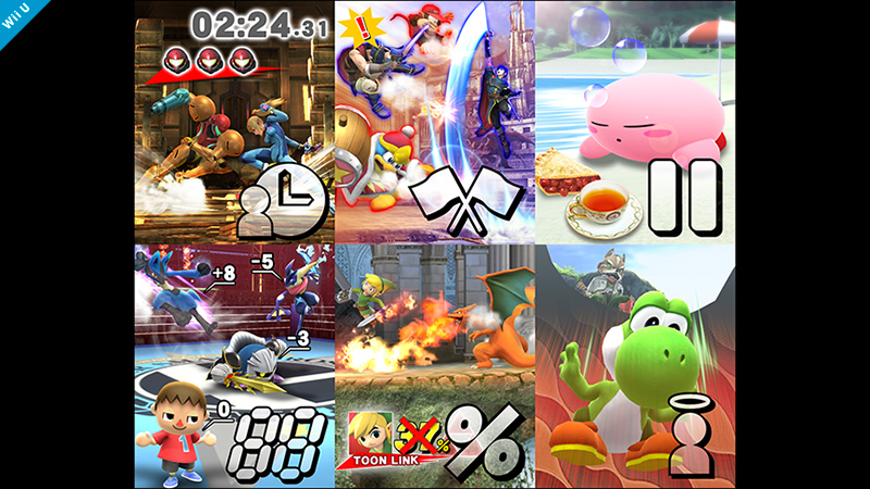 In the Wii U version, you can customize additional rules from the beginning of the game. Here are the pictures displayed for Stock Time Limit, Team Attack, Pause Function, SD Penalty, Damage Display, and Score Display. You can almost hear Fox’s cry in the picture displayed for SD Penalty settings.