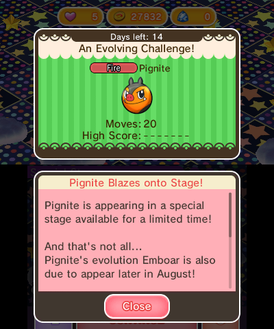 Pignite will be available until August 17th. Once that date arrives, it will be immediately followed by its final evolution Emboar! As usual with these new challenges and events, be sure to Check In once you boot up your game to update your game and gain access to the stage!