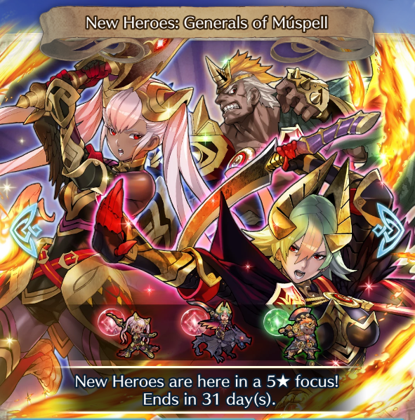 The Generals of Múspell Summoning Focus is now available in Fire Emblem Heroes. Try your hand at it for a chance to get Laevatein, Laegjarn and Helbindi. The Summoning Focus will be available for one whole month.