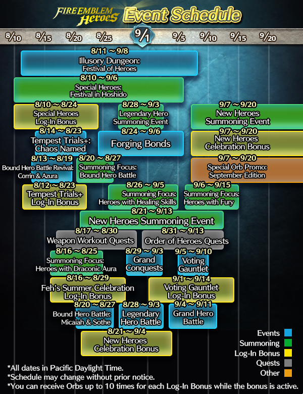 Quite a bit of Fire Emblem Heroes news today – first up, Intelligent Systems put out a new event calendar detailing all the events that will be happening in the game up until mid-September. You can see the calendar in the image above.
