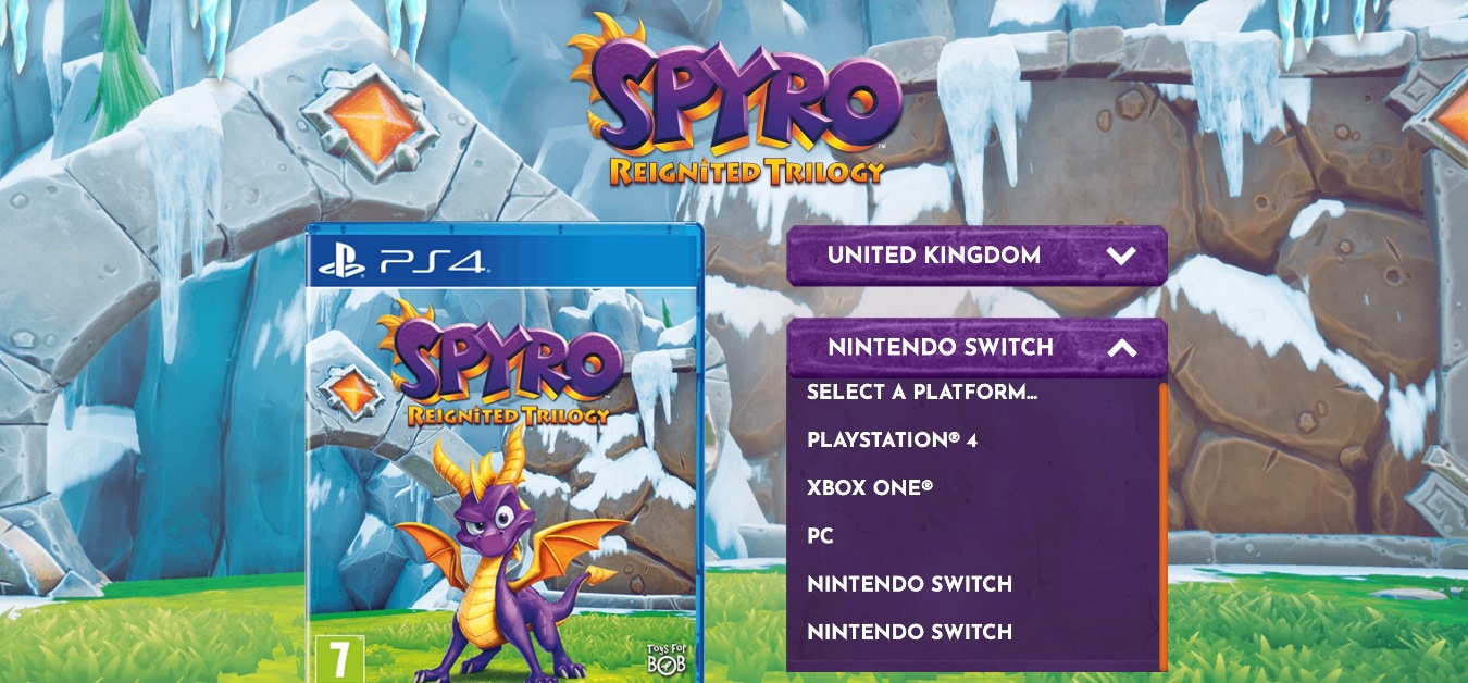 Even though the US website for Spyro the Dragon only lists the upcoming Reignited Trilogy for PlayStation and Xbox, the UK site also features PC and Switch. Strangely, the Switch is even listed twice!