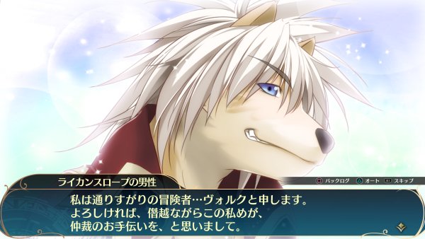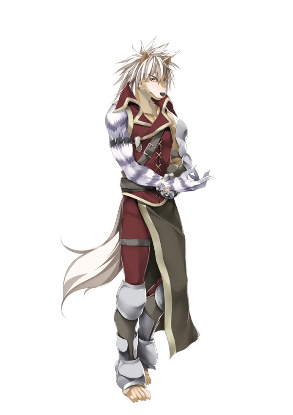 A lively young man of the Lycanthrope race. Enthusiastic and caring of his allies, he is someone to depend on. An all-purpose attacker, he can lure in enemy attacks and absorb the damage. He is the type to decide things in the spur of the moment. He plays the role of an older brother-type character to Alto, as his love for his allies is stronger than most and he can be relied on in times of emergency.