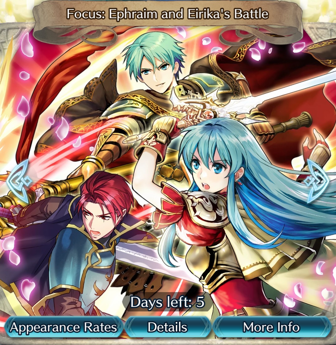 The third Bound Hero Battle event is tied in with summoning focus so you will be battling against Ephraim and Eirika in 3 difficulty levels (Hard, Lunatic, Infernal). Clearing each map will give you 2 Orbs each.