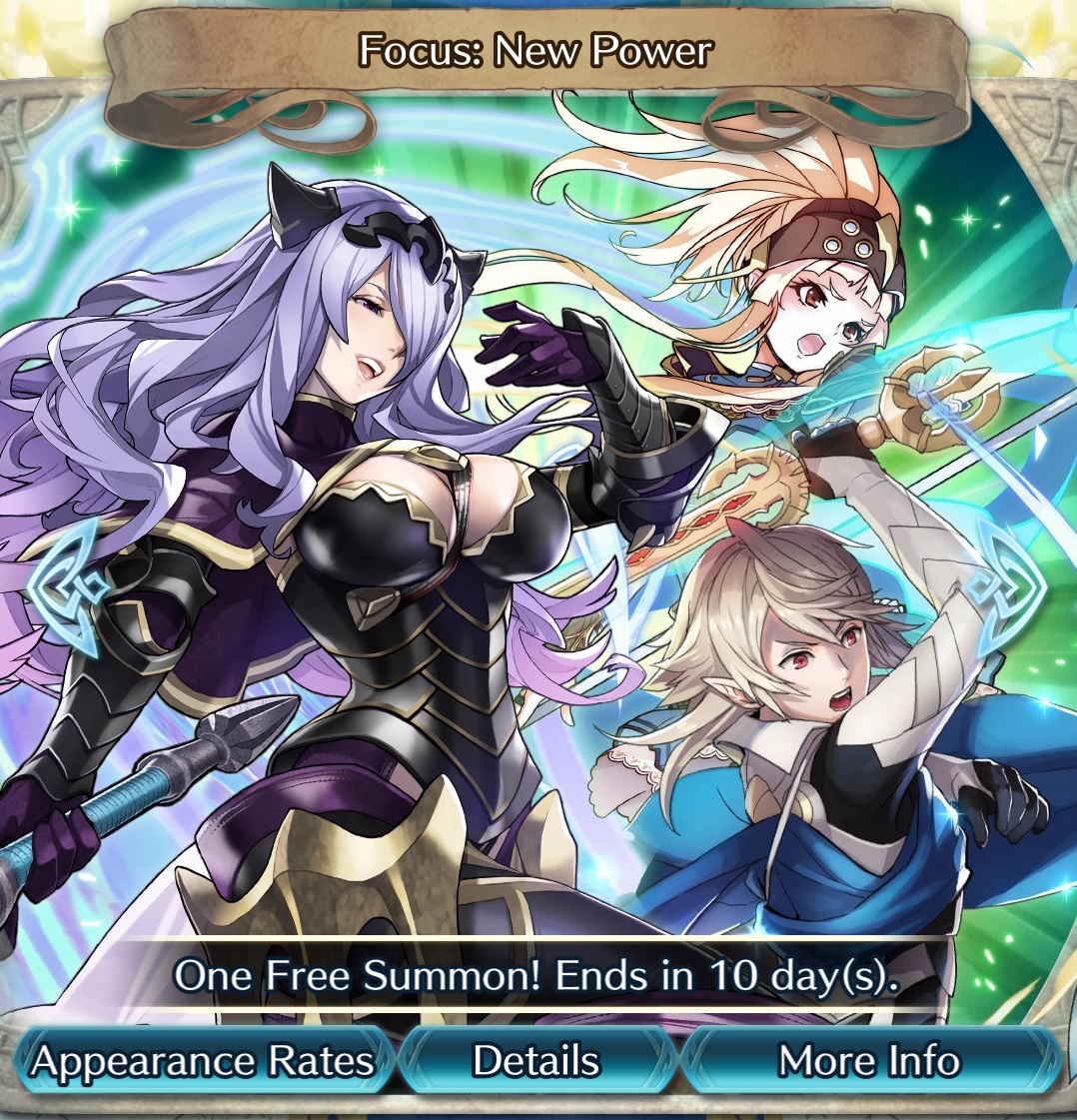 A new Summoning Focus is now live. It’s called “New Power” and it features 5 star versions of Corrin (Fateful Prince), Clair (Highborn Flier), and Camilla (Bewitching Beauty). This summoning focus will be available until May 27th.