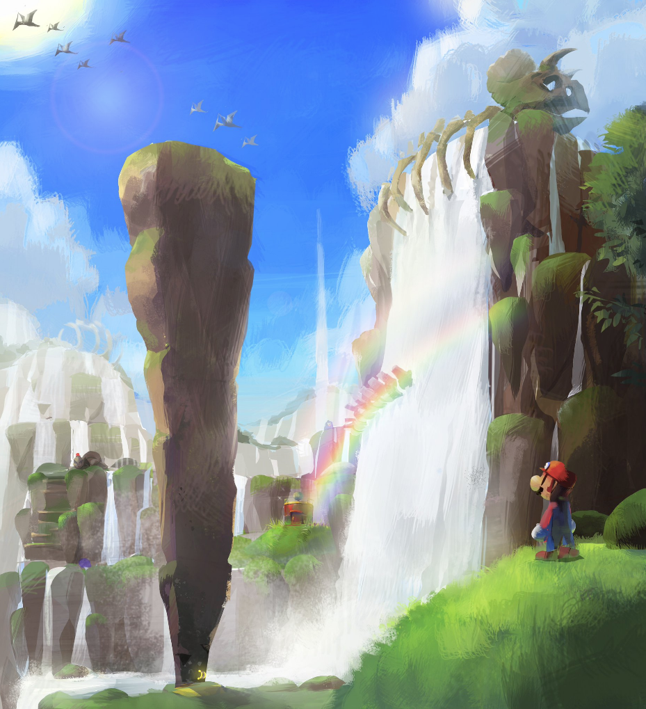 Nintendo is back with another piece of concept art from Super Mario Odyssey. Today, we have a look at Fossil Falls. Nintendo notes that the expansive blue sky and huge waterfall along with the Tyrannosaurus rex wearing a hat in the background is meant to give you the feeling of a grand adventure.