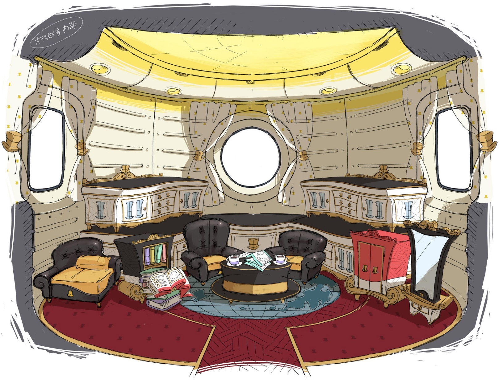 Nintendo is back with another piece of concept art from Super Mario Odyssey. Today, we have a sketch of the Odyssey’s interior, highlighting the hat-themed furniture in Mario’s airship.
