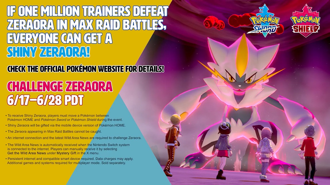 Starting today, Zeraora can be found in Max Raid Battles for Pokemon Sword/Shield. This is being done to celebrate the new Expansion Pass release. If one million defeat Zeraora, everyone will receive a shiny version of the Pokemon.
