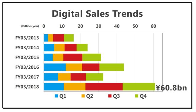 This graph compares the sales of digital content through our dedicated video game platform business over the past few years. To reflect these changing circumstances, what we used to refer to as “download sales” are now called “digital sales.” Our digital sales reached a new record high in the fiscal year ended March 2018. We are not disclosing the specific breakdown, but downloadable versions of packaged software and add-on content for Nintendo Switch did make a major contribution to growth in digital sales.