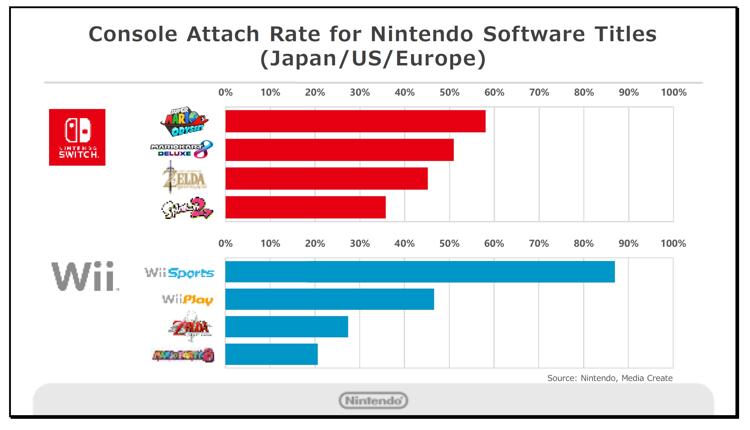 Take a look at this graph. It charts the console attach rates for the top four Nintendo software titles for Nintendo Switch. For comparison, there is a graph for sales after the same amount of time had elapsed for Wii. Wii Sports was an explosive trigger for Wii sales. Wii Sports was bundled with the Wii console in the North American and European markets.