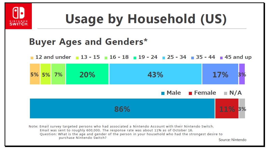 Here is some information on who is purchasing Nintendo Switch. These are the results of an Internet survey that was given to consumers in the US market in October who had linked a Nintendo Account to their Nintendo Switch system. Please keep in mind that these figures are only for the US market. As you can see, purchases are primarily made by male consumers in their 20s and early 30s. The results also show good interest among consumers in the 10 to 19 age range. This lets us look forward to future growth in our consumer base.