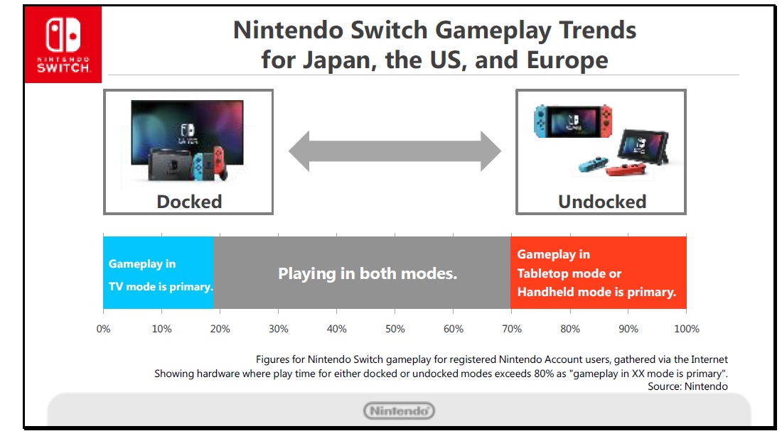 This indicates the Nintendo Switch gameplay trends. This chart is based on the figures for Nintendo Switch gameplay for registered Nintendo Account users, gathered via the Internet. There are three different Nintendo Switch play modes: TV Mode, where Nintendo Switch is docked and play occurs on a TV screen, and Tabletop Mode and Handheld Mode, where Nintendo Switch is removed from the dock. As the graph breaks it down, we can see how the different play modes for hardware use are classified, from the docked to the undocked experience. We can clearly see that consumers are playing to suit their own play styles.