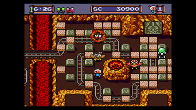 “BOMBERMAN has arrived to restore peace on the planet, which has been split into five parts by an evil hand! In addition to the nine members of the Bomber Family, the character ROOI shows up to lend a hand. Jump on the EGGS that appear from destroyed SOFT BLOCKS, and you can ride one of five types of ROOI. Each ROOI has different special abilities—use these well and you’ll ride to victory! Bombs that turn according to arrows and other new gimmicks have been added to BATTLE GAME, increased to ten stages. Tag-team matches are now possible, ensuring that this game will be a blast!”