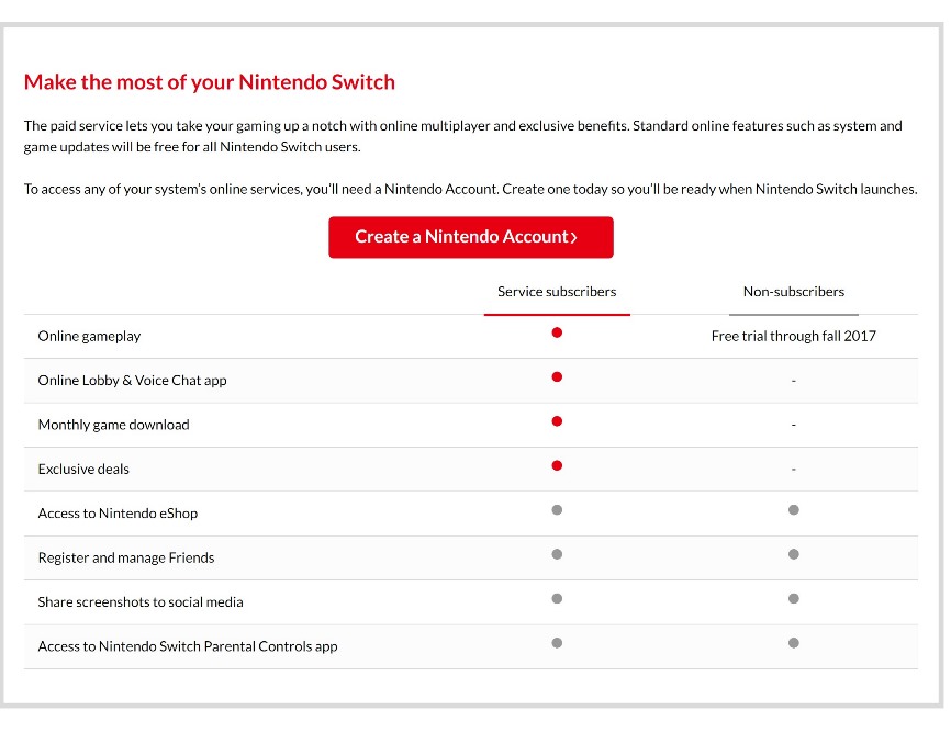 This service lets Nintendo Switch owners enjoy online multiplayer gaming as well as a dedicated smartphone app that connects to your Nintendo Switch system and helps you connect with friends for online play sessions.Check back for more details on the service and its features after the Nintendo Switch system launches.