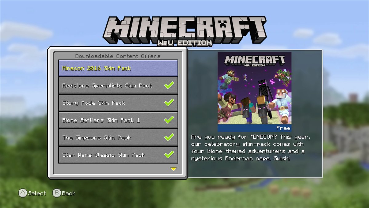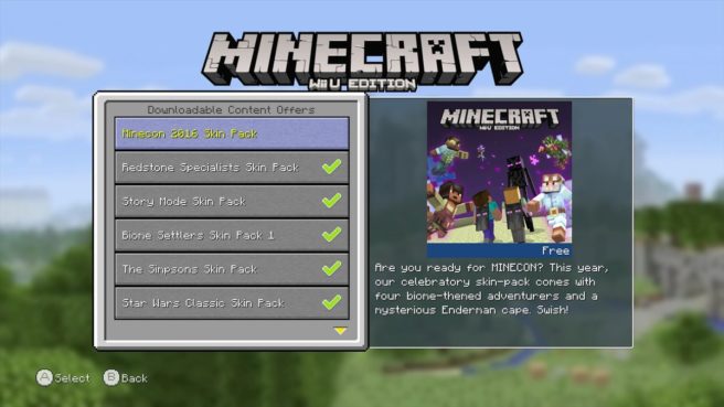 Minecraft: Wii U Edition can now download some free DLC for the game at no cost. Mojang and 4J Studios released the Minecon 2016 Skin Pack today, which provides access to “four biome-themed adventures and a mysterious Enderman cape.”