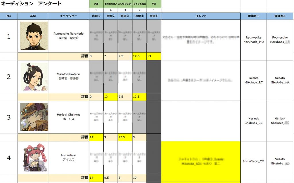 Going back to the casting process, we received around 4 – 5 demo reels per character from the casting directors and conducted a blind audition in which we didn’t know who the voice actors were. A few of us on the team listened to each and every reel, trying to figure out who we though sounded the most like Ryunosuke, or Iris, or Juror No. 3. Then, we compared notes and came up with our final list of top 2 picks per character like this: