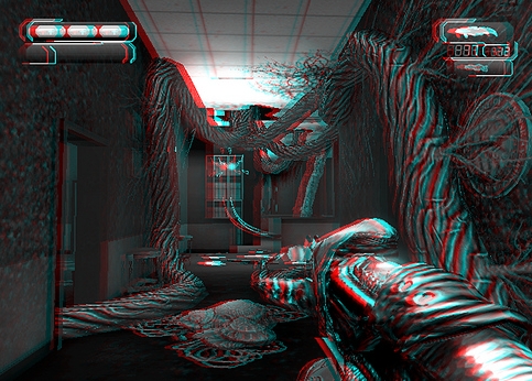 Our 3D images section took a hiatus for a couple of months, but now it’s back with a bang. And what game could possibly be reviving this feature? We choose the Wii title MadWorld, which has been out for about a month now. The best aspect of converting screenshots of the game into 3D is that since the the visuals are already in black and white, the color doesn’t take a big hit during the transition.