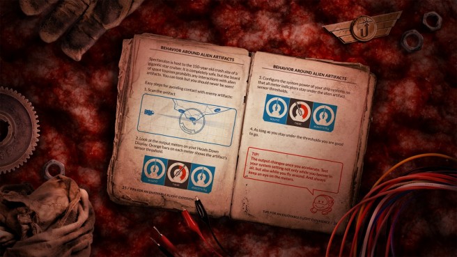 The first photo we’re posting is one of the loading screens that appears between sections in Affordable Space Adventures. It reminds players about the important gameplay mechanic of scanning artifacts to see their range and type of detection before they attempt to attack the spaceship. Loading screens in the game – as well as well as the Wii U digital instructions manual – show a manual written by Uexplore, the company that in the game’s universe offers “Cheap… but functional” spaceships to travel to Spectaculon.