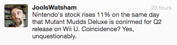 That’s not to say that people might not be suddenly on board with the Big N again or that the increase isn’t substantial (it’s the biggest jump since 2008), but chances are that this is more of a financial-jargon reason than anything we should be invested (pun) in as gamers. As Renegade Kid’s Jools Watsham put it: