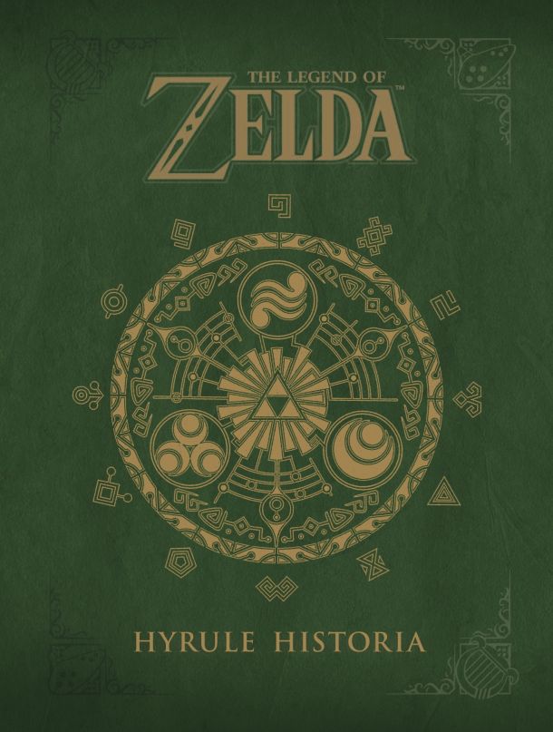“This is the official cover for the North American version of The Legend of Zelda: Hyrule Historia. The logo and gold colored design elements will be gold foil stamped. The large symbol on the cover is the Gate of Time from Skyward Sword. We felt that it was appropriate for a number of reasons. Hyrule Historia is a history book, not only about the development of the games, but the history of Hyrule as well. We wanted the reader to feel like they were stepping through the gate, back in time, and experiencing all aspects of the Legend of Zelda. As keen-eyed Zelda fans will tell you, the three symbols surrounding the triforce are the symbols of the three goddesses who… well, I’ll let you read the book to find out their signifance. But we loved the gate’s symbol because it is fraught with meaning, much of which is explained in different sections of the book, and appear again and again throughout the series. One of the other reasons is that there are Skyward Sword sections that bookend Hyrule Historia. It felt appropriate to put a symbol from the 25th anniversary game on the cover. I hope that you all like it as much as we do.”