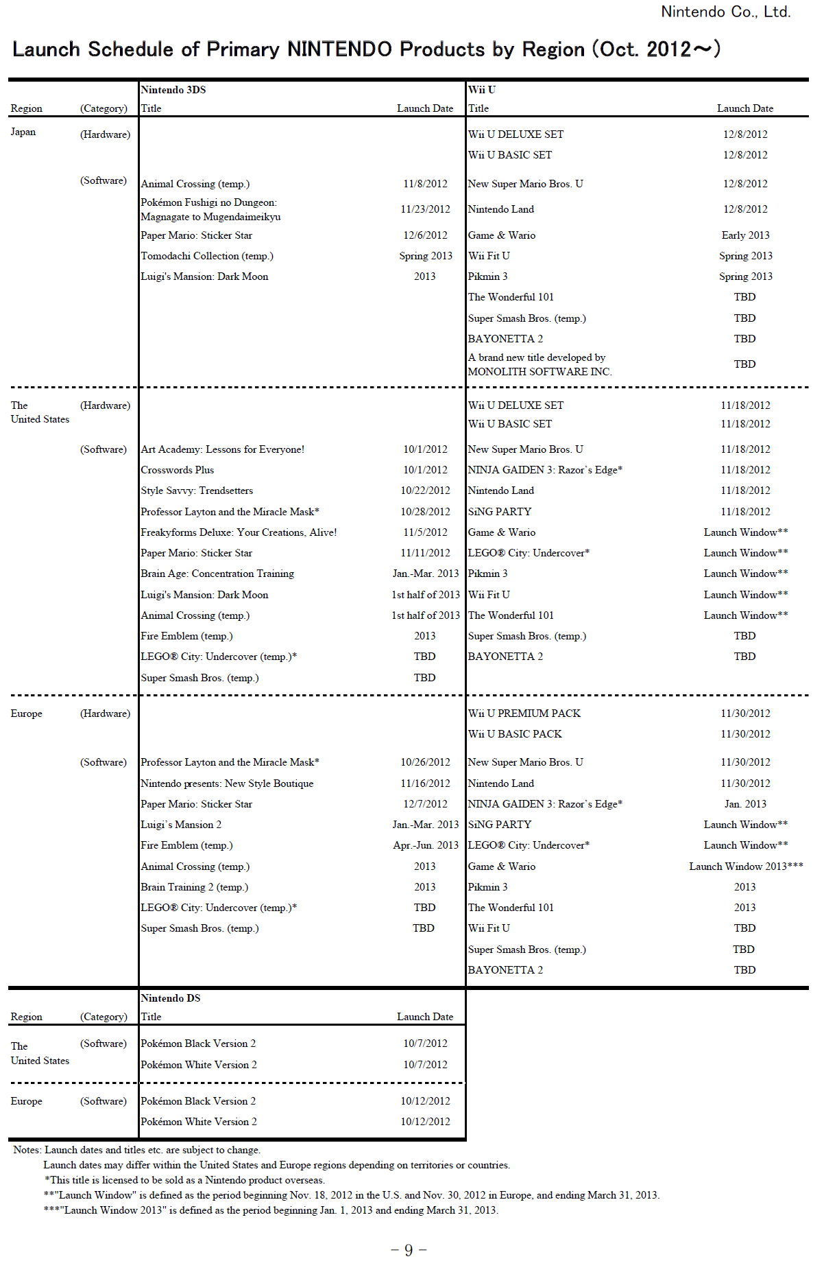 Nintendo has provided an updated release schedule as part of its financial materials.