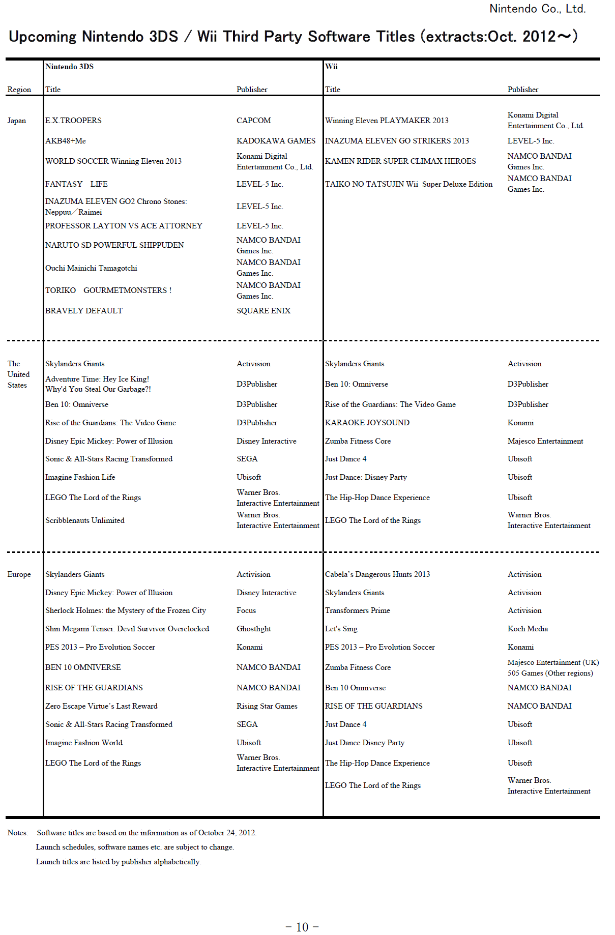 “The Company continues to focus on selling Nintendo 3DS during the second half of the fiscal year ending March 31, 2013 and aims to expand its business by launching the Wii U system as the successor of Wii in the year-end sales season in the main regions of the world. The earnings forecast has been modified to reflect a yen appreciation stronger than expected at the beginning of the fiscal year, the actual sales result for the six-month period ended September 30, 2012 and a change in the outlook for the following six-month period from October 2012 through March 2013 by reviewing the mix of each hardware and software sales unit forecast. During the second half of this fiscal year, the assumed exchange rate of the yen to the U.S. dollar has remained at 80 yen per U.S. dollar, while that of the yen to the euro has been revised from 105 yen to 100 yen per euro.”