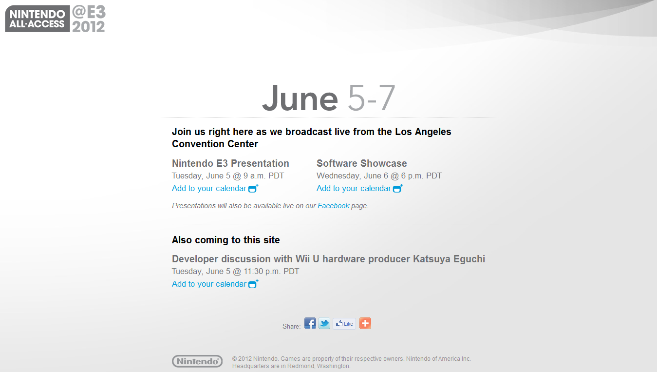 REDMOND, Wash.–(BUSINESS WIRE)– The 2012 E3 Expo is right around the corner, and fans from all over the world can look forward to accessing the latest Nintendo news right from the comfort of their homes. Nintendo will be using a mix of online, broadcast and social platforms to provide a steady stream of breaking news and announcements during the video game industry’s biggest annual trade show, taking place June 5-7 at the Los Angeles Convention Center. Featured content will include the Nintendo All-Access Presentation @ E3 2012, which viewers can access online at http://e3.nintendo.com, watch commercial-free on Viacom’s Spike TV and MTV2 television networks or stream via Facebook on June 5 at 9 a.m. Pacific time. Fans also will enjoy easy access to news and updates from Nintendo on YouTube, Twitter and Facebook throughout the E3 Expo, including information about the Nintendo 3DS hand-held system and the upcoming Wii U console.