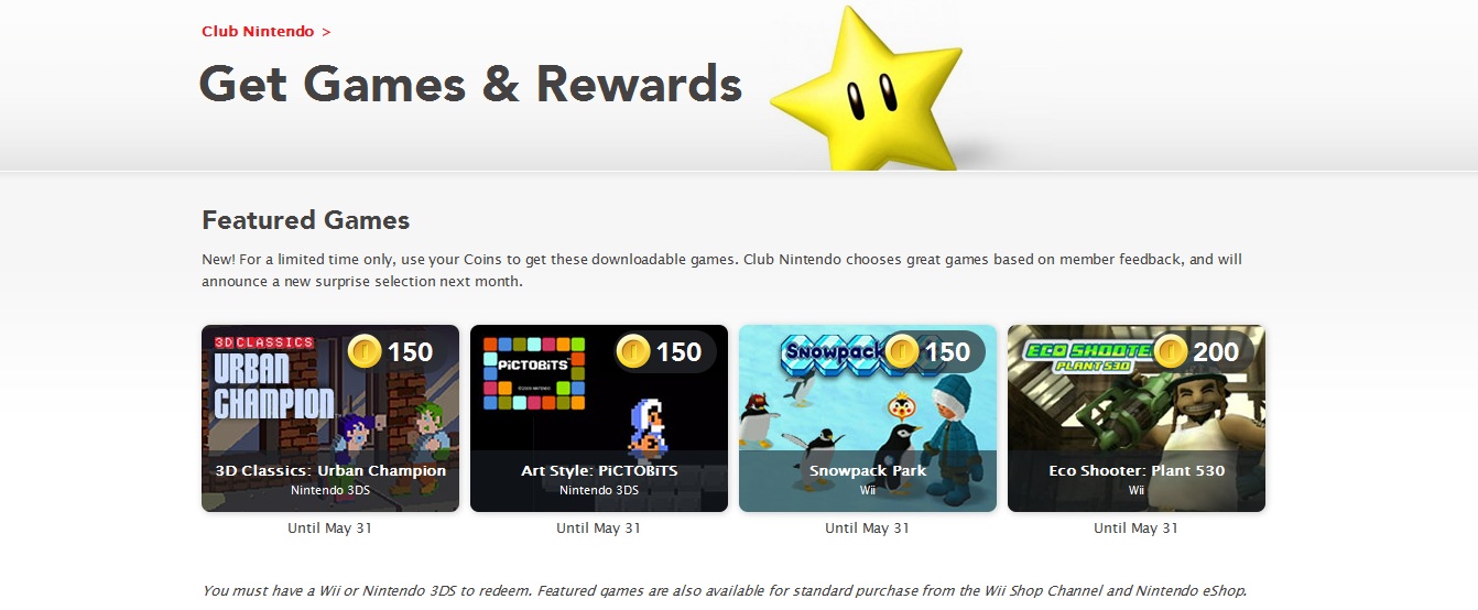 It’s the start of a new month, which means new downloadable rewards have been added to Club Nintendo. Members can choose from 3D Classics: Urban Champion (150 coins), Art Style: PiCTOBiTS (150 coins), Snowpack Park (150 coins), and Eco Shooter: Plant 530 (200 coins). Each game will remain on the service until June 1.